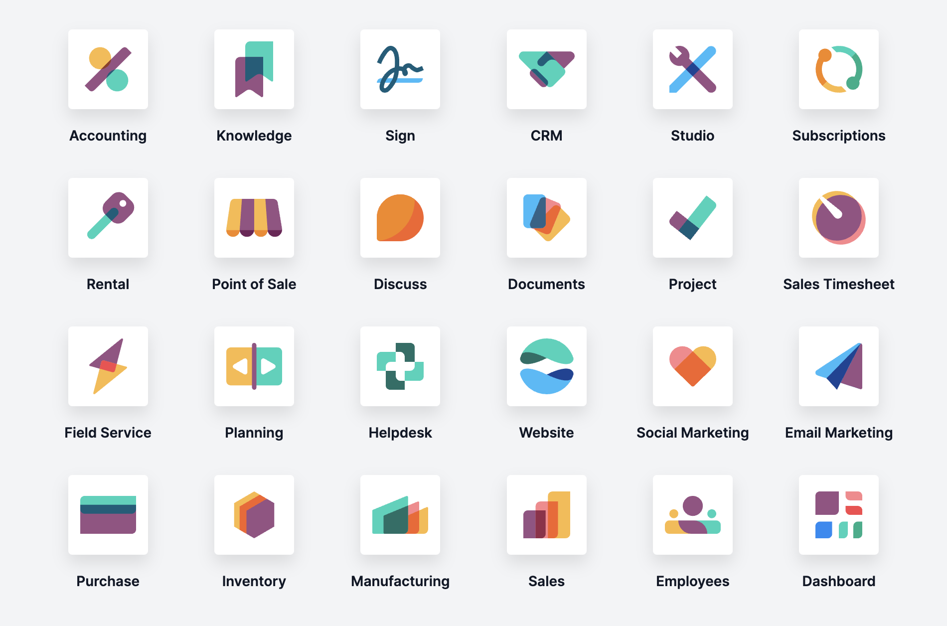 Odoo erbjuder över 40 olika appar. Allt från CRM, e-handel och bokföring till inventering, försäljning, och projektledning. Systemet uppdateras ständigt och en ny version släpps varje år. Det finns också möjlighet att göra specifika anpassningar för din verksamhet utöver det som erbjuds i Odoos egna appar.