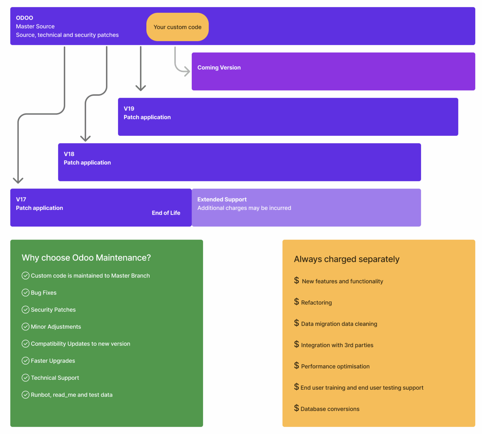 - Support for bug fixes (your code and or via Odoo patches)